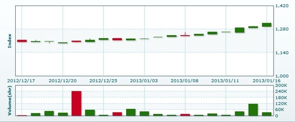 1月17日のラオス総合指数は前日比+45.76ポイント(3.48%)高の1361.22で取引を終えた。売買高は前日比+73.1%増の5万6534株、売買代金は同+60.3%増の3億6970万キープだった。