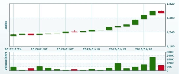 1月23日のラオス総合指数は前日比+9.15ポイント(0.64%)高の1437.51で取引を終えた。売買高は前日比約2.4倍の19万6438株、売買代金は同約2.4倍の13億6733万キープだった。