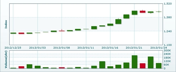 1月25日のラオス総合指数は前日比▲4.08ポイント(0.28%)安の1434.45で取引を終えた。売買高は前日比▲43.6%減の4万7924株、売買代金は同▲42.6%減の3億4370万キープだった。
