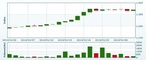 1月31日のラオス総合指数は前日比▲2.04ポイント(0.14%)安の1433.43で取引を終えた。売買高は前日比+39.4%増の3万3005株、売買代金は同+45.5%増の2億4248万キープだった。