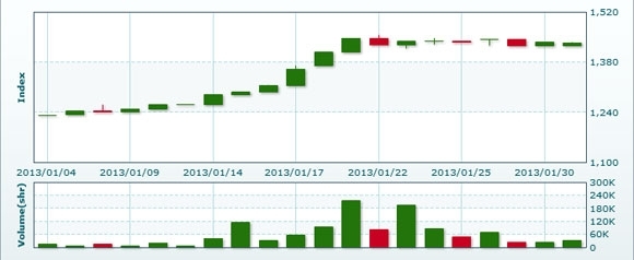 2月1日のラオス総合指数は前日比変わらずの1433.43で取引を終えた。売買高は前日比▲60.0%減の1万3198株、売買代金は同▲62.2%減の9175万キープだった。