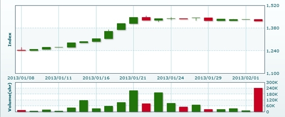 2月5日のラオス総合指数は前日比変わらずの1424.28で取引を終えた。売買高は前日比▲78.4%減の5万2610株、売買代金は同▲78.2%減の3億7317万キープだった。