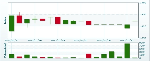 2月12日のラオス総合指数は前日比+9.15ポイント(0.64%)高の1433.43で取引を終えた。売買高は前日比▲97.9%減の1万8027株、売買代金は同▲97.7%減の1億3669万キープだった。