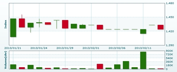 2月13日のラオス総合指数は前日比▲9.15ポイント(0.64%)安の1424.28で取引を終えた。売買高は前日比▲17.7%減の1万4840株、売買代金は同▲18.1%減の1億1196万キープだった。