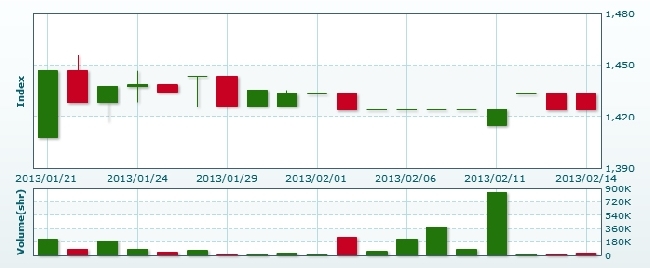 2月14日のラオス総合指数は前日比変わらずの1424.28で取引を終えた。売買高は前日比約2.3倍の3万4434株、売買代金は同約2.2倍の2億4555万キープだった。