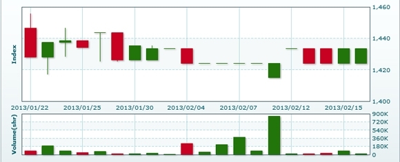 2月19日のラオス総合指数は前日比変わらずの1433.43で取引を終えた。売買高は前日比約2.4倍の4万5941株、売買代金は同約2.3倍の3億3598万キープだった。