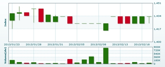 2月20日のラオス総合指数は前日比+1.02ポイント(0.07%)高の1434.45で取引を終えた。売買高は前日比+9.8%増の5万0454株、売買代金は同+5.8%増の3億5539万キープだった。