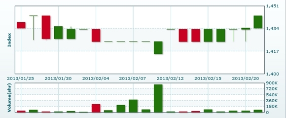2月22日のラオス総合指数は前日比▲18.31ポイント(1.27%)安の1425.30で取引を終えた。売買高は前日比+31.3%増の9万2170株、売買代金は同+31.4%増の6億5632万キープだった。