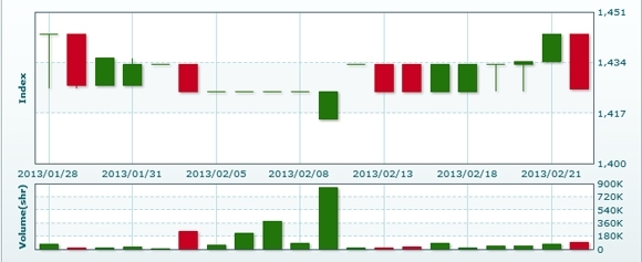 2月25日のラオス総合指数は先週末比+2.04ポイント(0.14%)高の1427.34で取引を終えた。売買高は先週末比▲49.0%減の4万7025株、売買代金は同▲45.8%減の3億5607万キープだった。