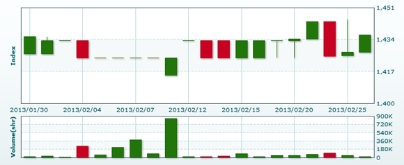 2月27日のラオス総合指数は前日比+9.16ポイント(0.64%)高の1445.65で取引を終えた。売買高は前日比+64.9%増の3万7828株、売買代金は同+74.7%増の2億7960万キープだった。