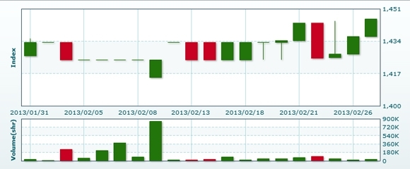 2月28日のラオス総合指数は前日比▲7.12ポイント(0.49%)安の1438.53で取引を終えた。売買高は前日比+89.6%増の7万1717株、売買代金は同+79.2%増の5億0089万キープだった。