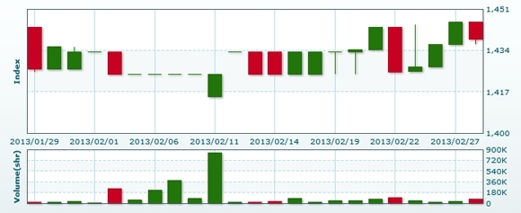 3月1日のラオス総合指数は前日比▲1.02ポイント(0.07%)安の1437.51で取引を終えた。売買高は前日比▲42.9%減の4万0975株、売買代金は同▲34.7%減の3億2702万キープだった。