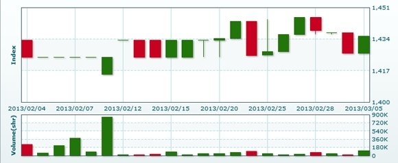 3月6日のラオス総合指数は前日比+2.04ポイント(0.14%)高の1437.51で取引を終えた。売買高は前日比+13.5%増の13万0390株、売買代金は同+19.1%増の9億5342万キープだった。