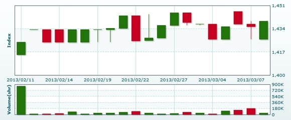 3月12日のラオス総合指数は前日比▲2.04ポイント(0.14%)安の1437.51で取引を終えた。売買高は前日比▲34.4%減の3万0662株、売買代金は同▲35.6%減の2億2002万キープだった。