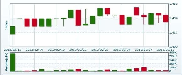 3月14日のラオス総合指数は前日比▲8.16ポイント(0.57%)安の1421.22で取引を終えた。売買高は前日比約3.9倍の15万2449株、売買代金は同約3.8倍の11億3629万キープだった。