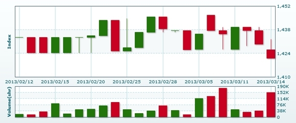 3月15日のラオス総合指数は前日比▲5.10ポイント(0.36%)安の1416.12で取引を終えた。売買高は前日比▲83.9%減の2万4549株、売買代金は同▲85.0%減の1億7099万キープだった。