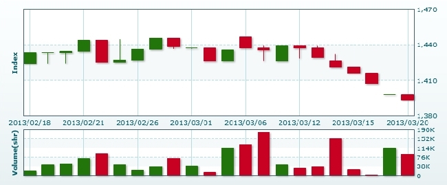 3月20日のラオス総合指数は前日比▲4.08ポイント(0.29%)安の1393.74で取引を終えた。売買高は前日比▲20.0%減の9万0263株、売買代金は同▲19.3%減の6億2347万キープだった。