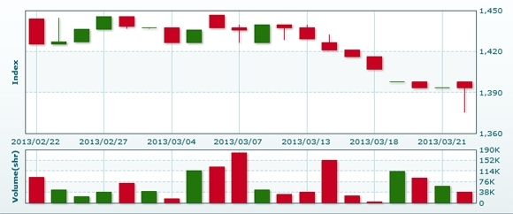 3月25日のラオス総合指数は先週末比+4.08ポイント(0.29%)高の1397.82で取引を終えた。売買高は先週末比約2.6倍の10万4491株、売買代金は同約2.5倍の7億1754キープだった。