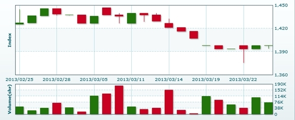 3月26日のラオス総合指数は前日比変わらずの1397.82で取引を終えた。売買高は前日比▲29.0%減の7万4225株、売買代金は同▲29.1%減の5億0904万キープだった。