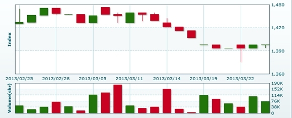 3月27日のラオス総合指数は前日比変わらずの1397.82で取引を終えた。売買高は前日比▲15.4%減の6万2785株、売買代金は同▲16.1%減の4億2724万キープだった。