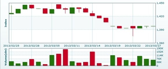 3月28日のラオス総合指数は前日比+4.07ポイント(0.29%)高の1401.89で取引を終えた。売買高は前日比+55.6%増の9万7713株、売買代金は同+56.8%増の6億6981万キープだった。