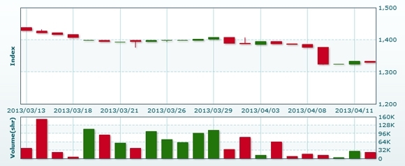 4月12日のラオス総合指数は前日比▲3.06ポイント(0.23%)安の1330.68で取引を終えた。売買高は前日比▲15.8%減の2万3083株、売買代金は同▲16.6%減の1億6081万キープだった。