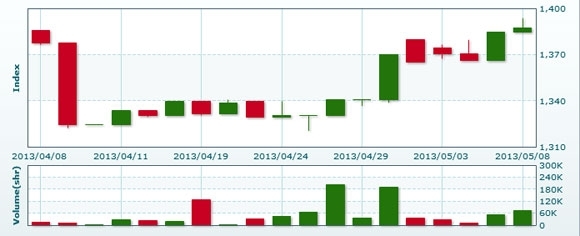 5月8日のラオス総合指数は前日比+3.06ポイント(0.22%)高の1387.64で取引を終えた。売買高は前日比+41.8%増の7万5177株、売買代金は同+36.2%増の5億1361万キープだった。