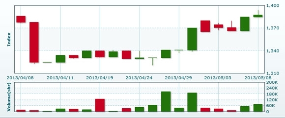 5月9日のラオス総合指数は前日比▲30.52ポイント(2.2%)安の1357.12で取引を終えた。売買高は前日比▲23.7%減の5万7386株、売買代金は同▲23.2%減の3億9425万キープだった。