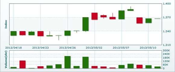 5月14日のラオス総合指数は前日比+9.15ポイント(0.67%)高の1376.45で取引を終えた。売買高は前日比+28.6%増の3万7397株、売買代金は同+23.4%増の2億5841万キープだった。