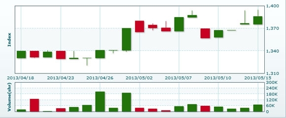 5月15日のラオス総合指数は前日比+9.15ポイント(0.66%)高の1385.6で取引を終えた。売買高は前日比+88.8%増の7万0610株、売買代金は同+91.6%増の4億9513万キープだった。