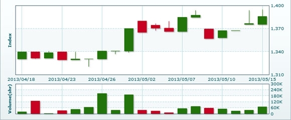 5月16日のラオス総合指数は前日比▲9.15ポイント(0.66%)安の1376.45で取引を終えた。売買高は前日比約2倍の14万1376株、売買代金は同+92.9%増の9億5523万キープだった。