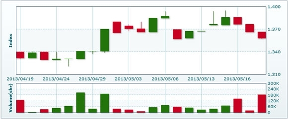 5月20日のラオス総合指数は先週末比▲8.14ポイント(0.6%)安の1358.14で取引を終えた。売買高は先週末比約8.5倍の18万1829株、売買代金は同約8.4倍の12億1094万キープだった。