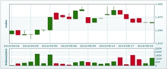5月23日のラオス総合指数は前日比変わらずの1358.14で取引を終えた。売買高は前日比約3.7倍の13万4330株、売買代金は同▲約4倍の9億7909万キープだった。