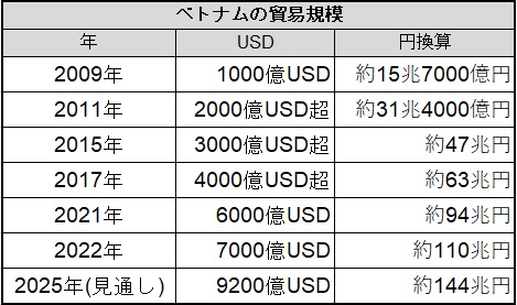 ベトナムの貿易規模は2009年の1000億USD(約15兆7000億円)から、2011年に2000億USD(約31兆4000億円)超、2015年に3000億USD(約47兆円)超、2017年に4000億USD(約63兆円)超と段階的に拡大した。さらに、2021年に6000億USD(約94兆円)、2022年に7000億USD(約110兆円)を超え、2025年には9000億USD(約140兆円)台に到達した。