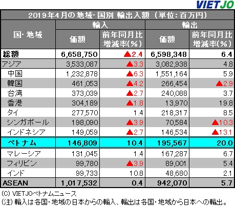 日本の財務省が発表した2019年4月の貿易統計(速報)によると、ベトナムの対日貿易収支は前年同月比+62.7%増となる487億5800万円の黒字だった。