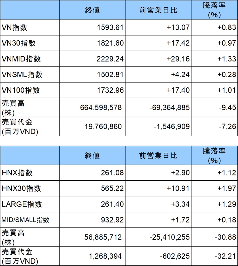 売買代金は19兆7609億VND(約1160億円)、前日比▲7.3%減少した。主力株は値上がり銘柄が多く、インデックスをけん引した。