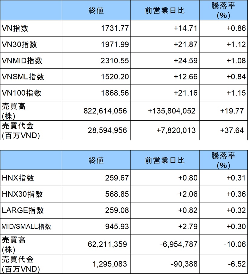 売買代金は28兆5950億VND(約1680億円)、前日比+37.6%増加した。主力株は値上がり銘柄が多く、インデックスをけん引した。