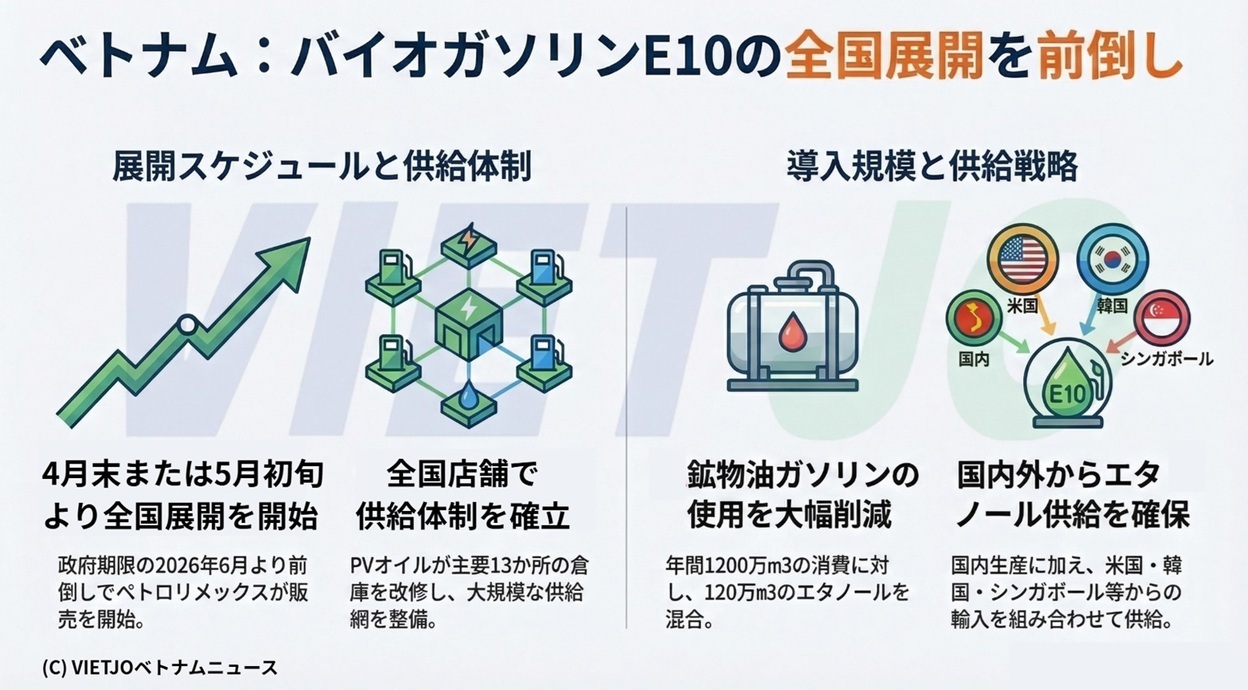 ベトナム国内の石油元売り各社は、エネルギー安全保障の強化と化石燃料の輸入依存からの脱却を目指し、ガソリンエンジン用「E10ガソリン」(バイオエタノール10%混合ガソリン)の全国展開を、商工省が定めた2026年6月1日の期限よりも前倒しで進めている。