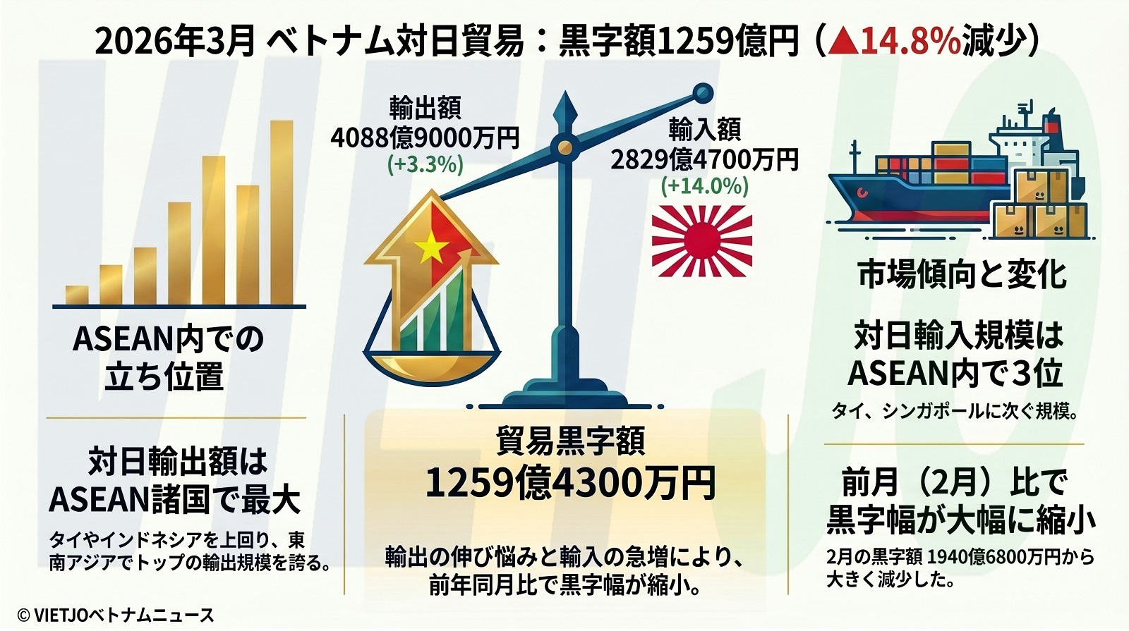 日本の財務省が発表した2026年3月の貿易統計(速報)によると、ベトナムの対日貿易収支は前年同月比▲14.8%減の1259億4300万円の黒字となった。