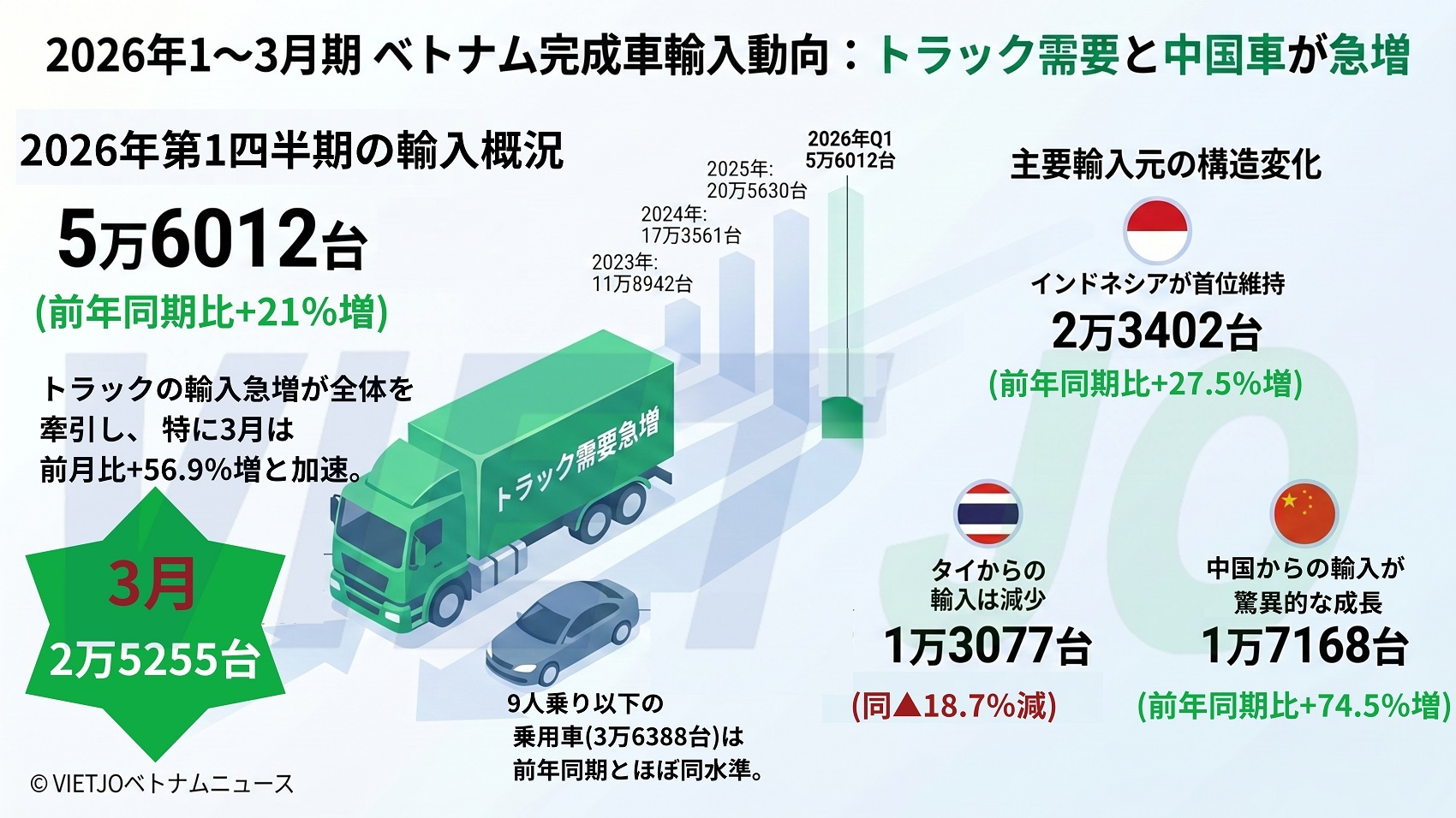 税関局の統計データによると、2026年1~3月期の完成車(CBU)輸入台数は前年同期比+21%増の5万6012台と急増した。