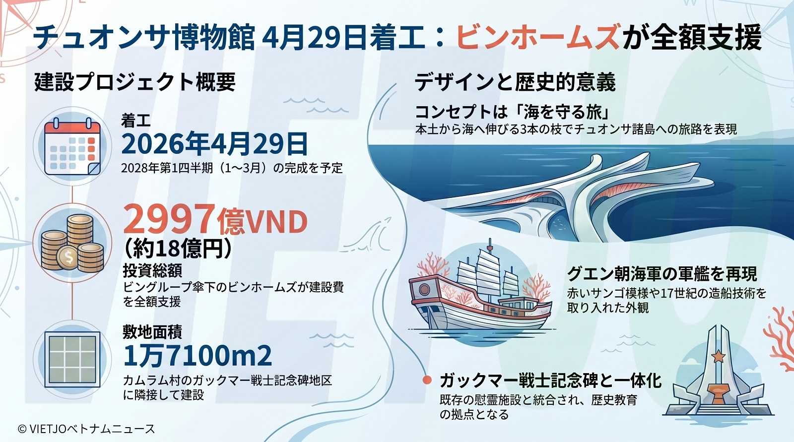 同博物館は、ガックマー戦士記念碑地区に隣接する約1万7100m2の敷地に建設される。建設面積は約3873m2で、本土からチュオンサ諸島と南シナ海に向かって伸びる3本の枝を表現し、「海を守る旅」を連想させるデザインとなっている。