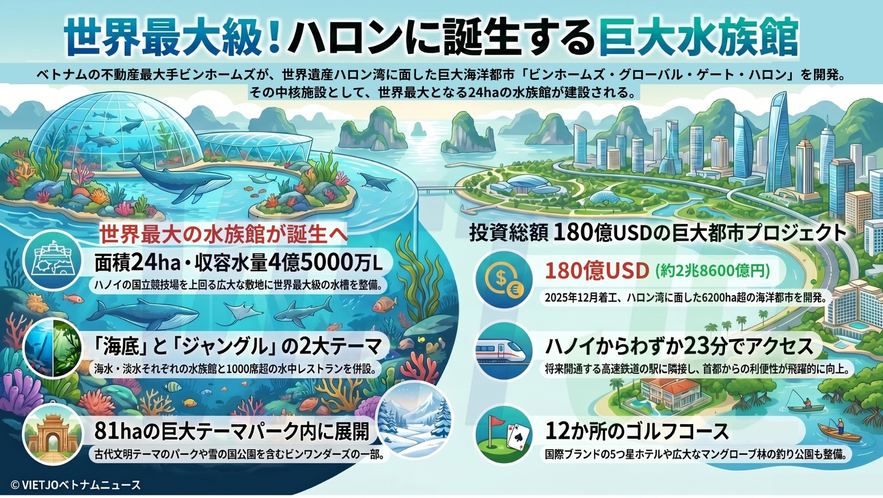 不動産開発を中核とする民間複合企業ビングループ[VIC](Vingroup)の子会社で住宅開発最大手ビンホームズ[VHM](Vinhomes)はこのほど、東北部地方クアンニン省で開発する巨大な海洋都市プロジェクト「ビンホームズ・グローバル・ゲート・ハロン(Vinhomes Global Gate Ha Long)」の建設計画を発表した。同都市には、世界最大の水族館が建設される見通しだ。