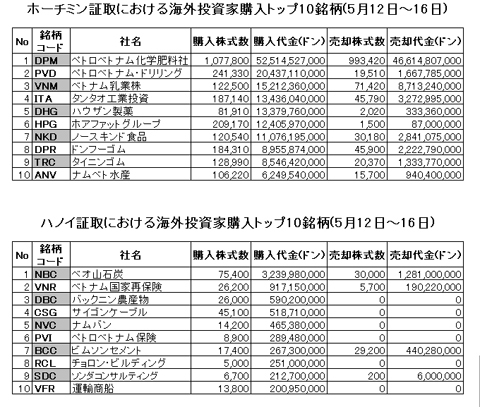 ベトナム株情報 > ベト株ニュース > 市場概況 > 海外投資家購入トップ10(5月12日~16日)