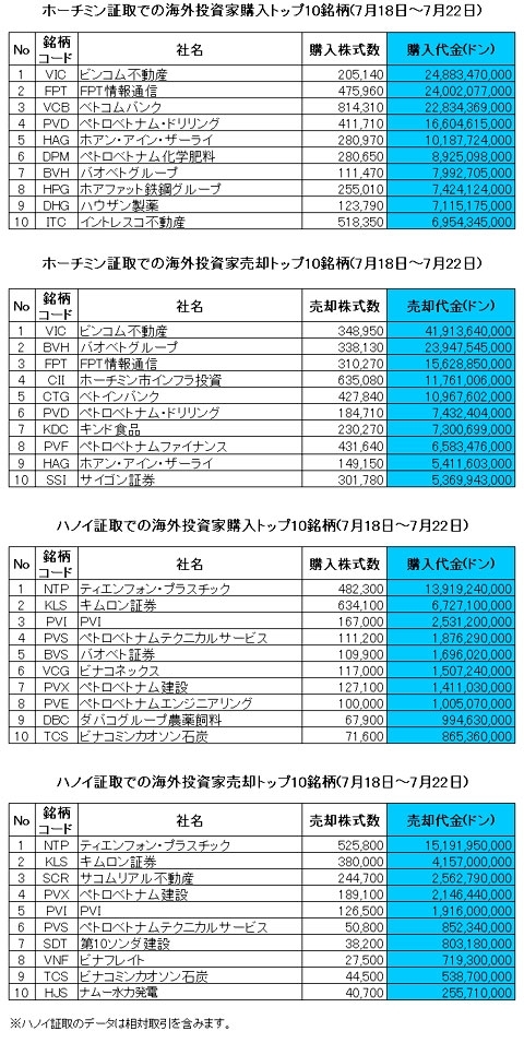 ベトナム株情報 > ベト株ニュース > 市場概況 > 海外投資家の週間取引トップ10 (7月18日~7月22日)