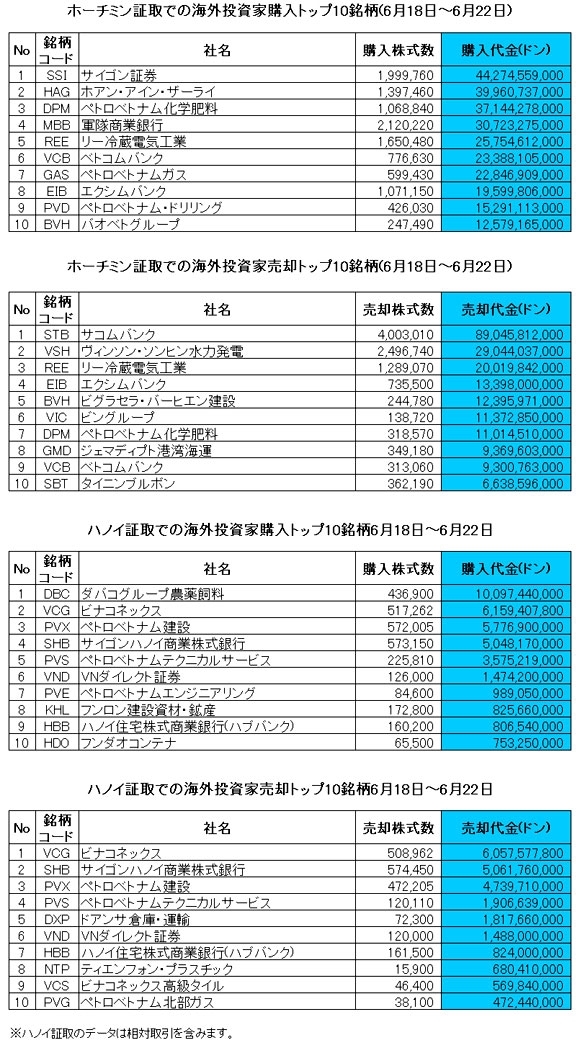 ベトナム株情報 > ベト株ニュース > 市場概況 > 海外投資家の週間取引トップ10 (6月18日~6月22日)