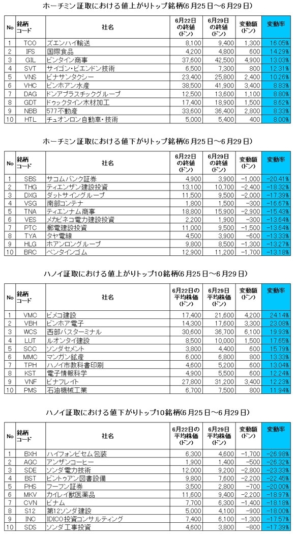 ベトナム株情報 > ベト株ニュース > 市場概況 > 株価変動週間トップ10 (6月25日~6月29日)