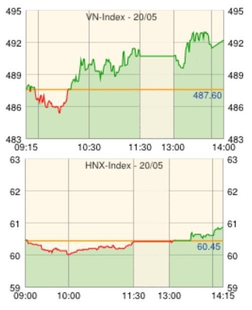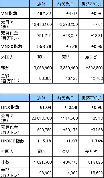 ホーチミン証券取引所の本日の取引は、多くの中小型銘柄の上昇がインデックスを押し上げ、反発して取引を終えた。主力株では、カスミナタイヤ[CSM]、ジェマディプト港湾海運[GMD]、ホアファット鉄鋼グループ[HPG]などが上昇。一方、サコムバンク[STB]、ペトロベトナム化学肥料[DPM]、タイニンブルボン[SBT]などが下落した。主力株以外では、キンバックシティーグループ[KBC]がストップ高。その他、ペトロベトナムガス[GAS]、タンタオ不動産[ITA]などが値を上げた。また、本日は第13期(2011~2016年)第5期国会が開幕した。今回の国会では、マクロ経済政策など複数の重要な政策について討議される予定。