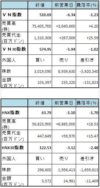 ホーチミン証券取引所の本日の取引は、大きくプラスで寄り付き、前場中盤で一時的にマイナス圏に入るも、前日終値を僅かに上回る水準で推移。だが、引けにかけて売りが強まり、反落して取引を終えた。