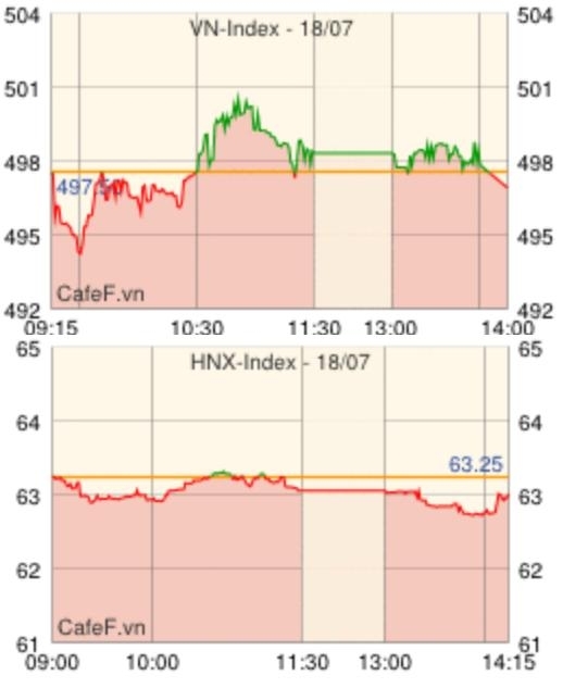 ホーチミン市証券取引所の18日の取引は、バーナンキ米連邦準備制度理事会(FRB)議長の議会証言での柔軟な姿勢を受けて、前日の米国株が上昇した影響で各国市場が値を上げたのに対し、前日ベトナムではガソリン価格の値上げが発表されたことが影響し、マイナスで寄り付いた。前場中盤まではマイナス圏で推移したが、カスミナタイヤ[CSM]、ダナンゴムタイヤ[DRC]、ホアセン鉄鋼グループ[HSG]などの主力株が買われて株価を押し上げプラス圏へ、一時500ポイントを超えた。その後プラス圏を維持するも、大引けで売られてマイナス圏に転落、前日終値を▲0.66ポイント下回って取引を終えた。