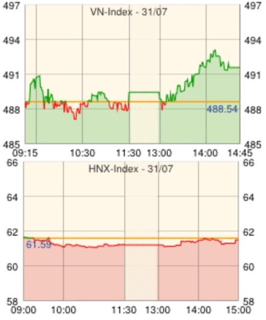 ホーチミン市証券取引所の31日の取引は、僅かにマイナスで寄り付き、前場はプラス圏とマイナス圏を行き来する展開となった。前場ではペトロベトナムガス[GAS]、ビナミルク[VNM]、ビングループ[VIC]が買われたが、相場は軟調でインデックスの押し上げにはならず、買い材料無く夏枯れの様相で前場引けではマイナス圏に。しかし、後場に入ってGAS、VNMの他、ペトロベトナム・ドリリング[PVD]、ホアセン鉄鋼グループ[HSG]、サイゴン証券[SSI]などが買われてインデックスを押し上げ、前日終値を+3.31ポイント上回る491.85ポイントで取引を終えた。相対取引を含まない売買高は前日比約▲10%となっており、暫くは軟調な取引が続くと見られる。